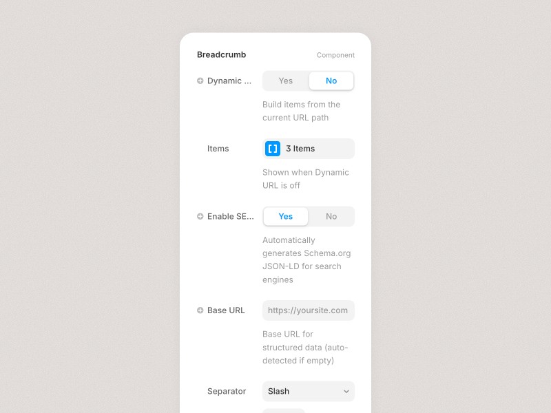 Framer Dynamic Breadcrumbs updates in real time as pages change —no manual linking required. Yet, you can also switch to manual mode if you wish to set the steps yourself. Fully responsive, SEO-friendly, and easy to style to match your design system. Simply copy and paste the component were you want it, Framer Dynamic Breadcrumbs works directly on a page or when using in a CMS or Page Template.